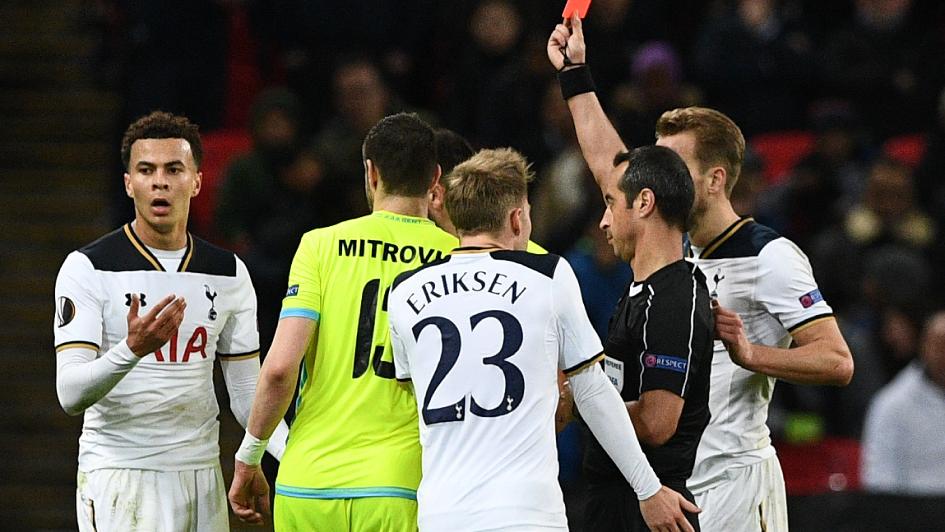 Alli received a straight red card for his reckless tackle on Gent's Brecht Dejaegere, in which the 20-year-old speared his right foot high into Dejaegere's shin.